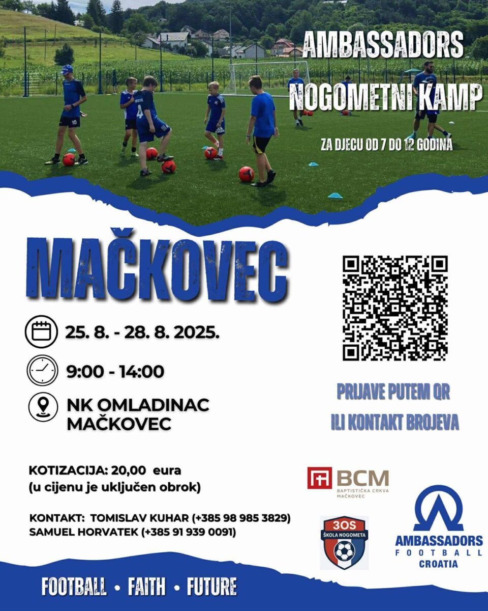Prijave traju do 24.kolovoza, a organizatori pozivaju svu djecu da povedu i svoje prijatelje te zajedno dožive nogometnu avanturu u Mačkovcu. Kamp je organiziran u suradnji s Ambassadors Footballom – organizacija koja promiče sport i Riječ Božju, te novoosnovanom školom nogometa 3OS (Mačkovec, Mihovljan i Novo Selo Rok).
